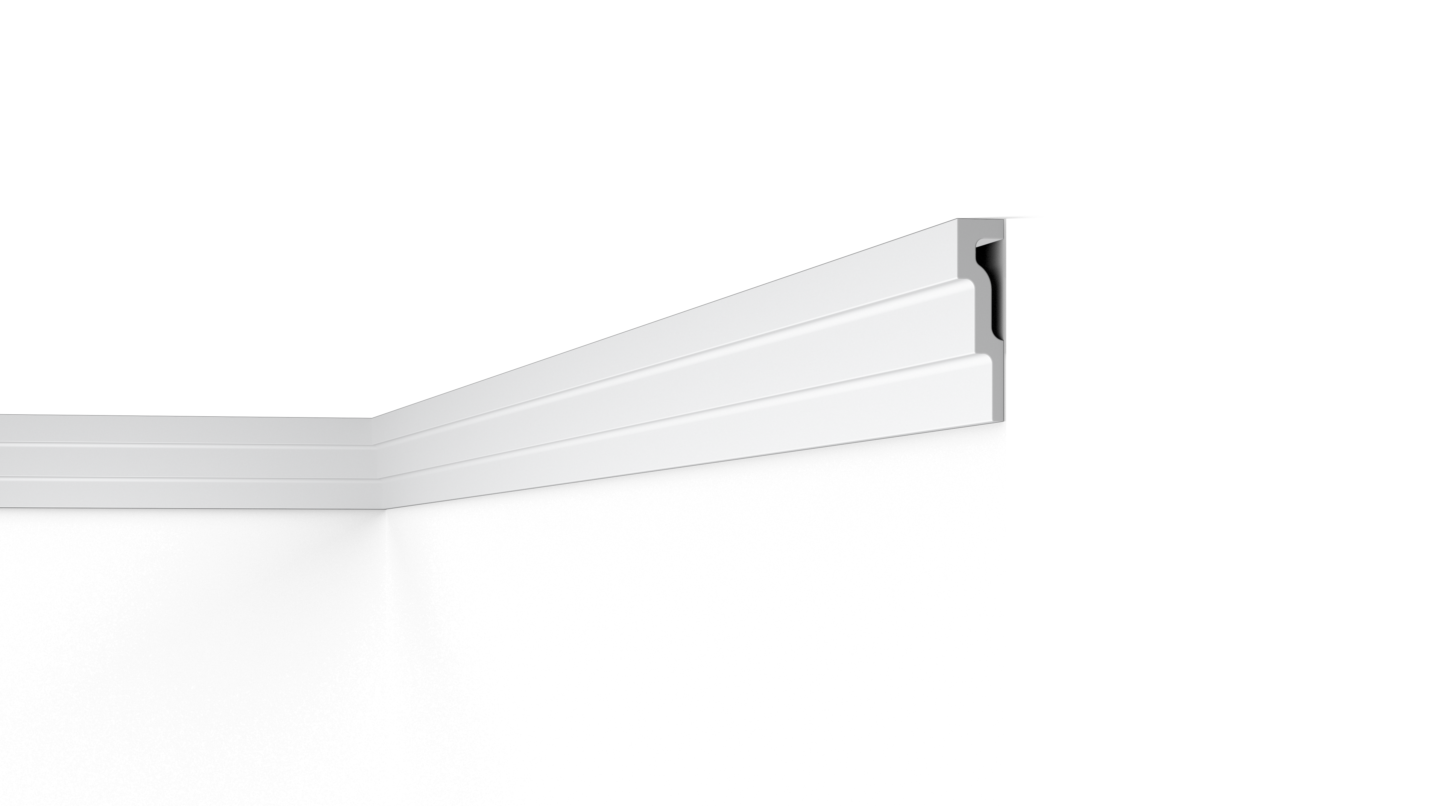 Mit direkter oder indirekter Beleuchtung kombinierbare Decken-, Wand- und Sockelleisten sowie Wanddekoraktionselemente.