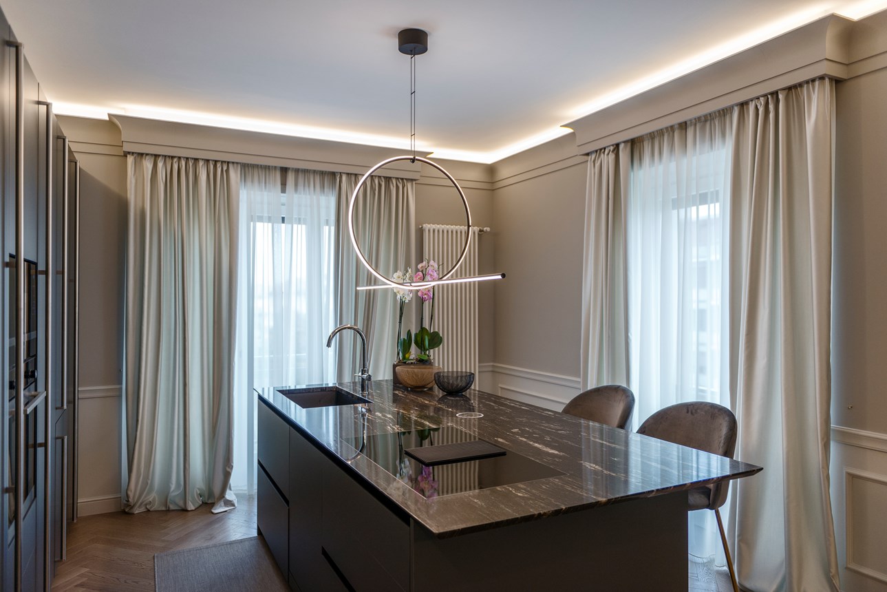 Mit direkter oder indirekter Beleuchtung kombinierbare Decken-, Wand- und Sockelleisten sowie Wanddekoraktionselemente.