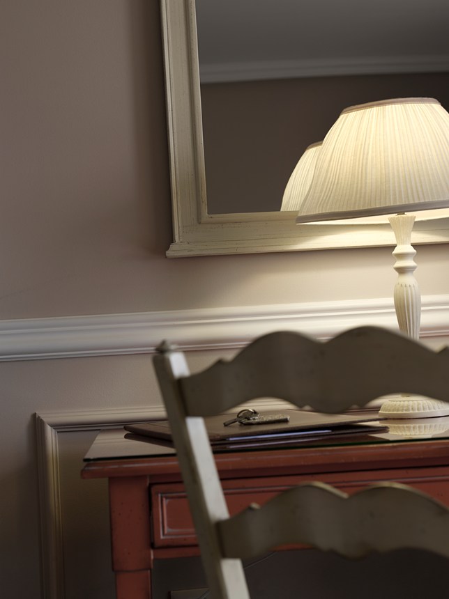 Cornices, picture rails, baseboards, and wall decorations to combine with direct or indirect lighting for a cozy atmosphere.
