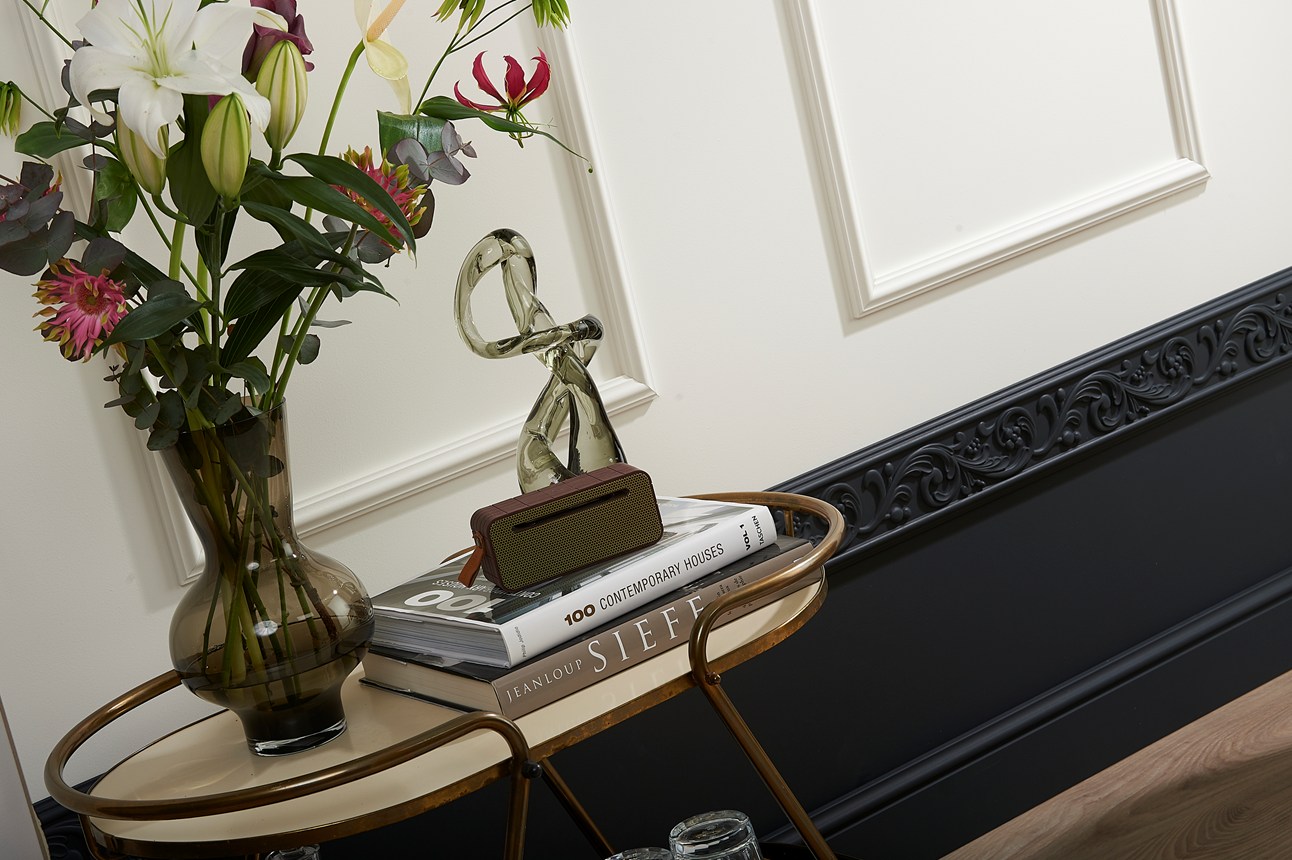 Benadruk de elegantie van een interieur met de Z12 ARSTYL® wandlijst. Het gedetailleerde dessin creëert een traditionele design toets die ofwel een klassiek interieur versterkt ofwel een mooi contrast biedt met een moderne stijl. Het bloemmotief is geïnspireerd op de klassieke natuurstijl.
